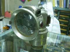 カーバイトランプ、詳細不明です。少し小さめのタイプです。発生したアセチレン炎を衝突させる独特のノズルが見えますでしょうか?
